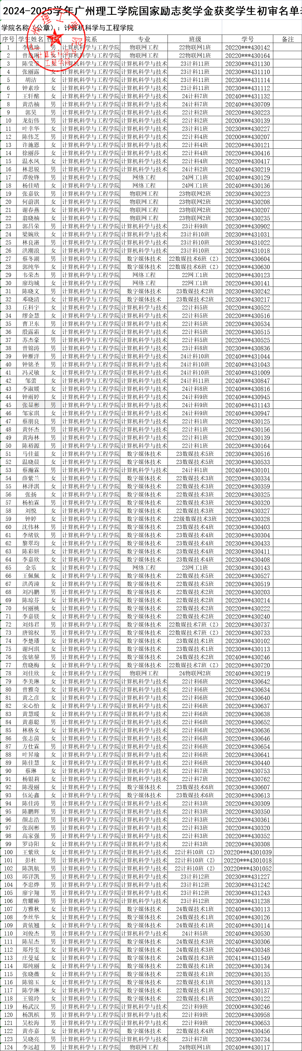 根据《关于开展2024-2025学年国家励志奖学金评选工作通知》(广州理工学助函〔2025〕11号),经学生本人申请及学院评议,现将开云kaiyun体育官方网站2024-2025学年国家励志奖学金拟推荐名单予以公示。公示期为2025年9月25日至9月28日,共计3个工作日。如对公示有异议,请在公示期内向辅导员老师反馈,或以书面形式并署真实姓名投信到信息楼309办公室旁信箱或电子信箱jsjxy@gzist.edu.cn反馈,也可致电计算机学院办公室:020-87477070。