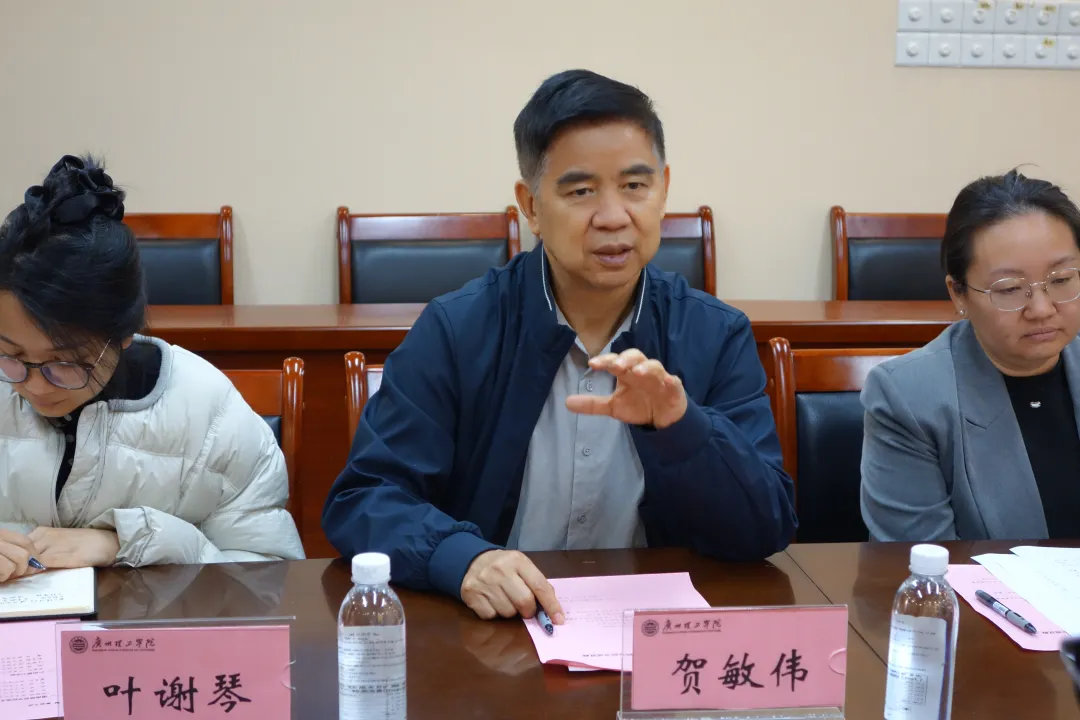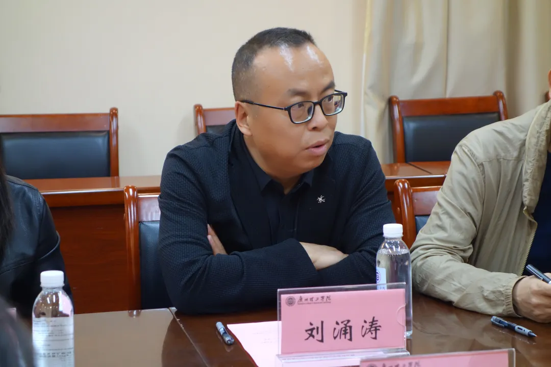 随后,渭南师范学院美术学院副院长刘涌涛在发言中介绍了学院的专业建设情况。他表示,此行主要是为了学习和借鉴贵校的办学经验,并重点分享了学院在校企合作方面的探索。学院积极对接乡村振兴、非遗传承等项目,引导学生参与实践,但由于陕西历史文化资源丰富、可挖掘内容众多,项目开展也面临一定挑战。他提到,以往未参与过实践项目的学生就业压力较大,为此学院正逐步将真实项目引入课程,通过“项目化教学”提升学生综合能力。他也坦言,深化校企合作仍存在一定难度,希望今后能加强交流,共同探索更有效的协同育人路径。