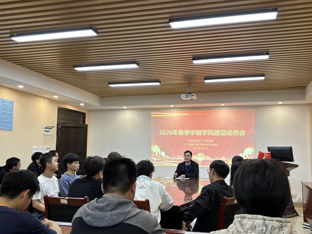 2026年3月1日,计算机科学与工程学院、人工智能与数字经济产业学院召开2026春季学期学风建设动员大会。会议采用线上线下联动模式,惠州校区同步线上参会,计科学院与产业学院各年级各班班长、纪委现场参会。会议由陈健老师主持并部署学风建设相关学生工作,学院党总支书记蔡岳良出席会议并作动员讲话,为新学期学风建设工作指明方向。