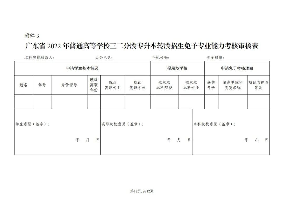 3.广东省2022年普通高等学校三二分段专升本转段招生免予专业能力考核审核表