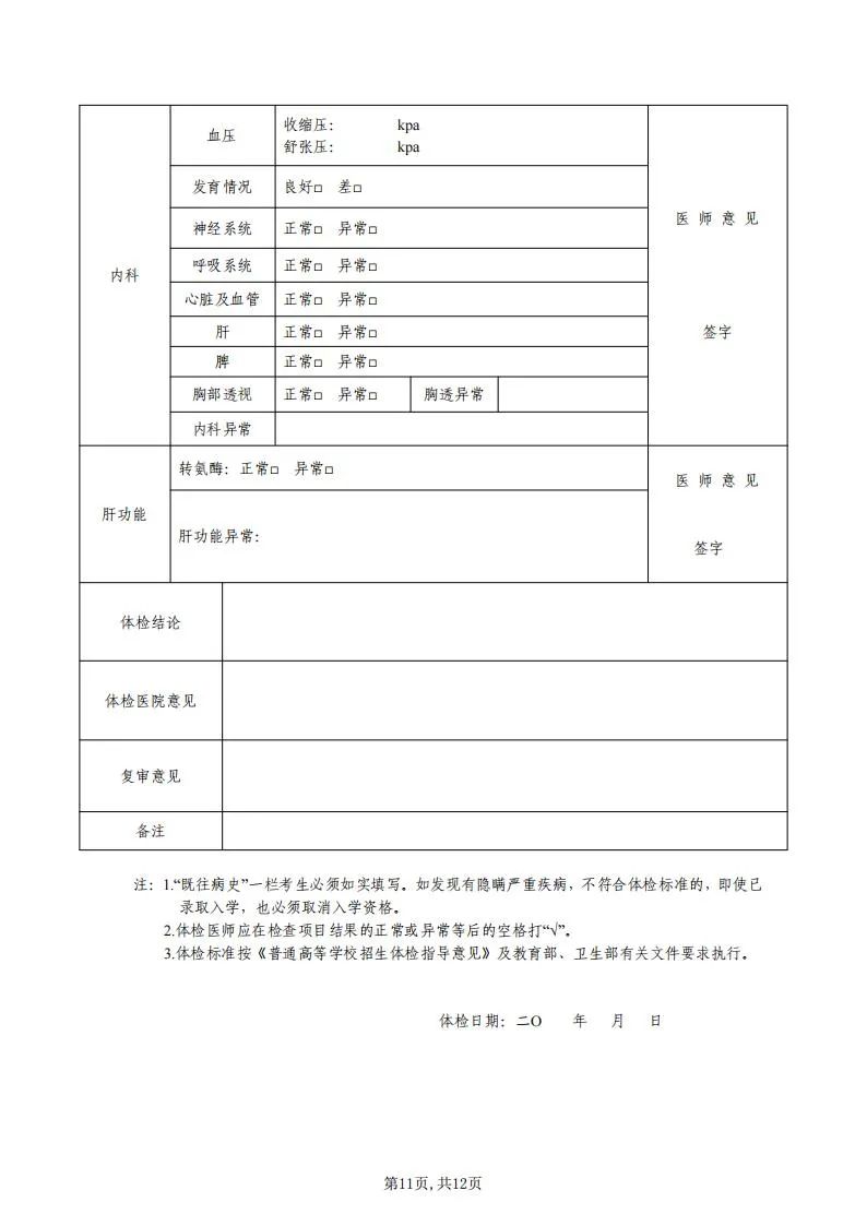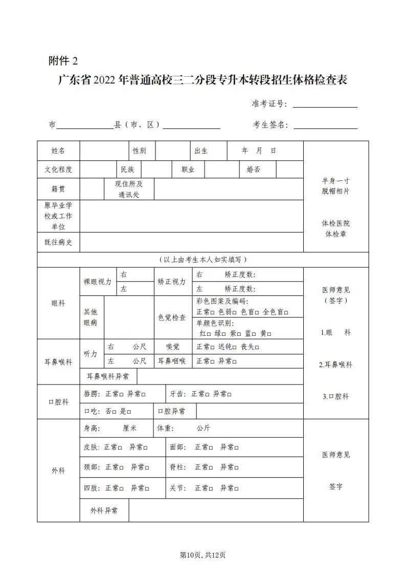 2.广东省2022年普通高等学校三二分段专升本转段招生体格检查表